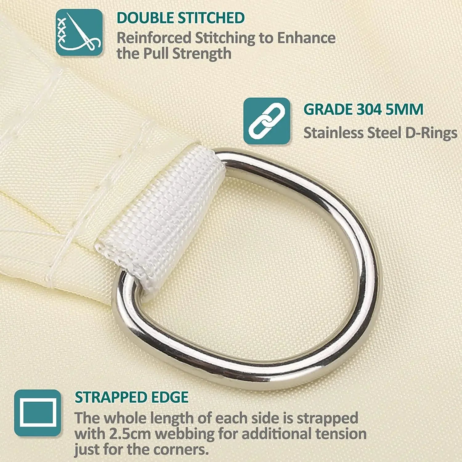 Measure and clean the area where the shade sail is to be installed. Leave an allowance of 1.5-2ft between the fixing point and the shade sail to fit hardware/ hooks or ropes. Curved sides to enhance pull strength and prevent drooping, so the actual shading area would shrink slightly, tolerance 4~6 inches for each side. You could install different shade sails of different colors and sizes to get a larger shading area.