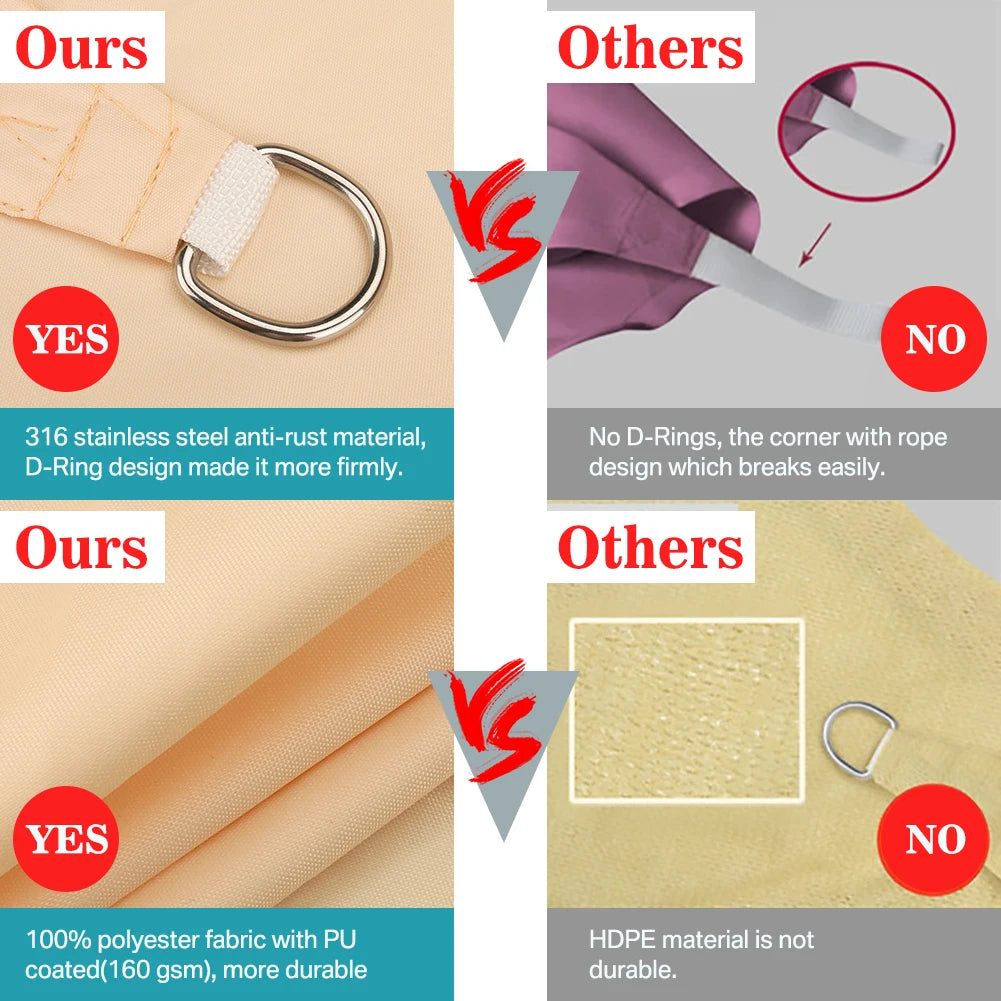 Measure and clean the area where the shade sail is to be installed. Leave an allowance of 1.5-2ft between the fixing point and the shade sail to fit hardware/ hooks or ropes. Curved sides to enhance pull strength and prevent drooping, so the actual shading area would shrink slightly, tolerance 4~6 inches for each side. You could install different shade sails of different colors and sizes to get a larger shading area.
