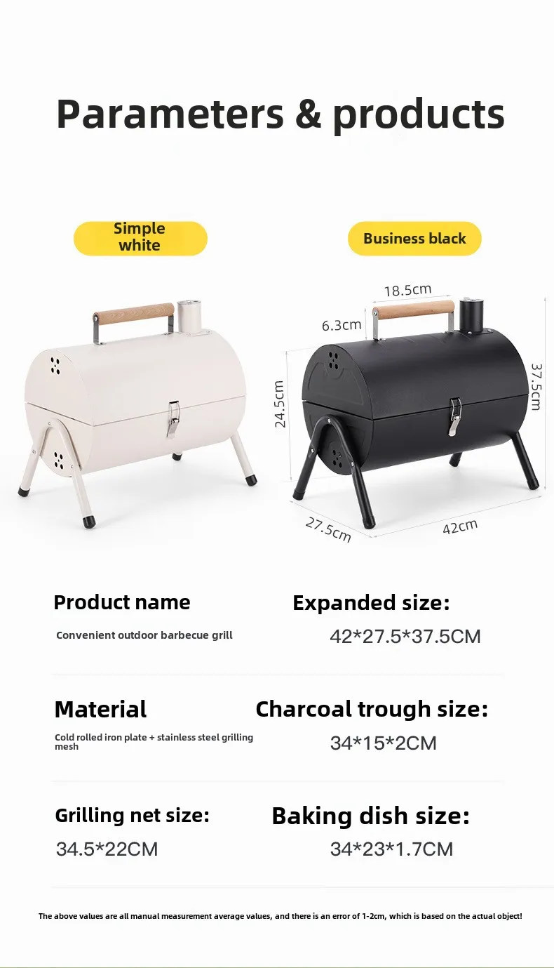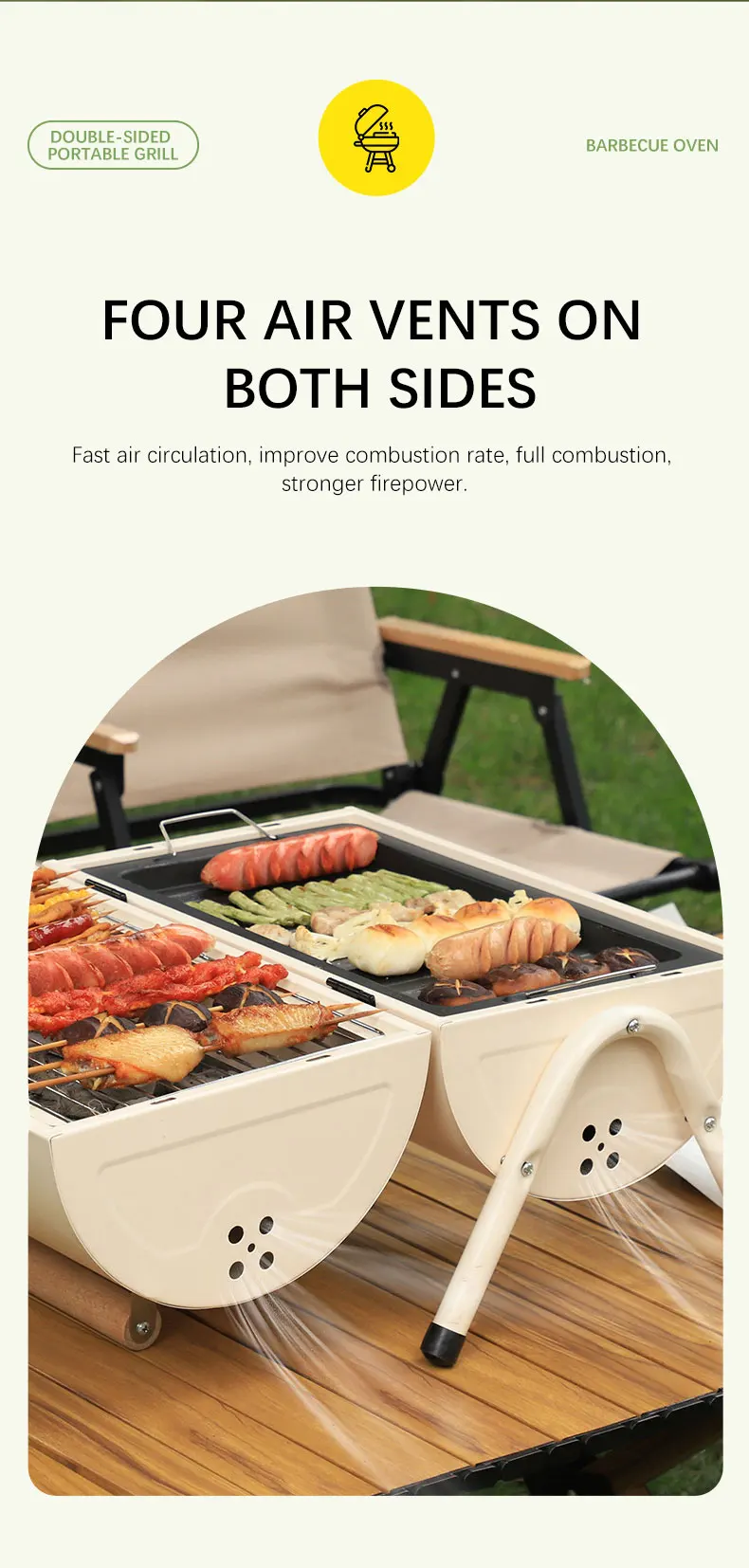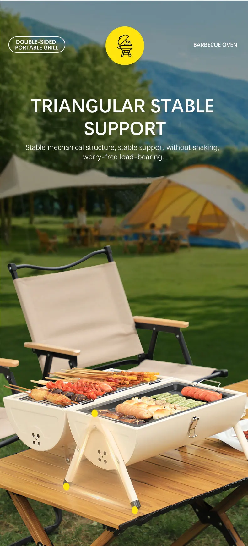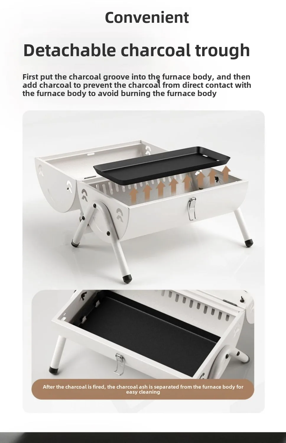 Welcome to our store. This barbecue grill is compact, beautiful, and simple. The furnace body is supported by a triangular bracket, which is very stable and will not move. There are small ventilation openings on both sides, which do not require manual assistance for combustion. Although small, it has multiple functions such as braising, frying, and grilling, which can meet the taste needs of different people.