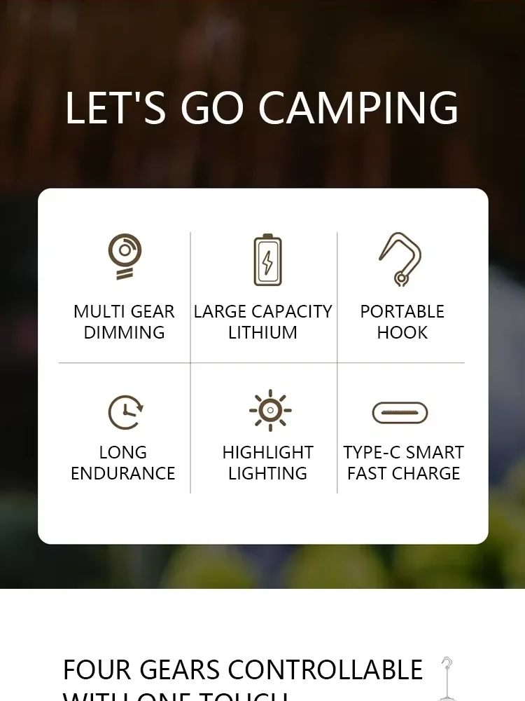 1. Light Gear: Long press stepless dimming, short press switching: warm light - white light - warm yellow light - warm white light.